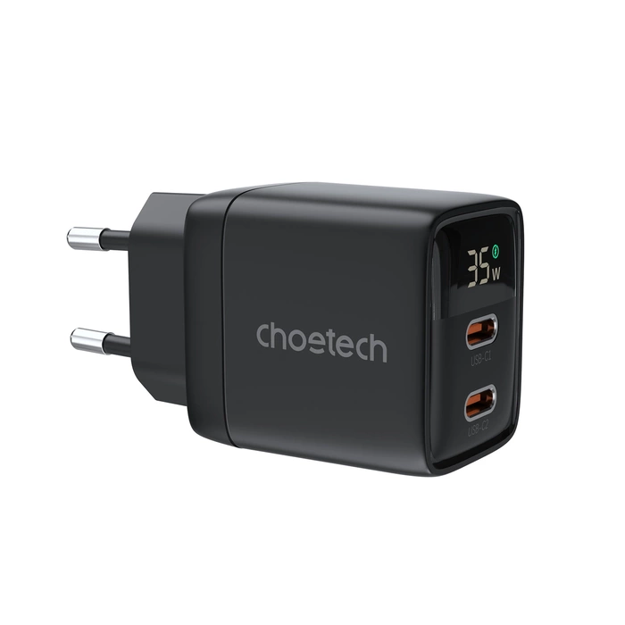 Choetech PD6051 GaN charger with USB-C and USB-C PD connectors, 35W, with display - black
